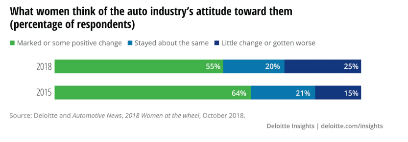 For example, in 2015, 64 percent of the survey respondents said they had seen a marked or positive change in the automotive industry’s attitude toward women over the previous five years. However, only 55 percent expressed the same opinion in the 2018 survey results.